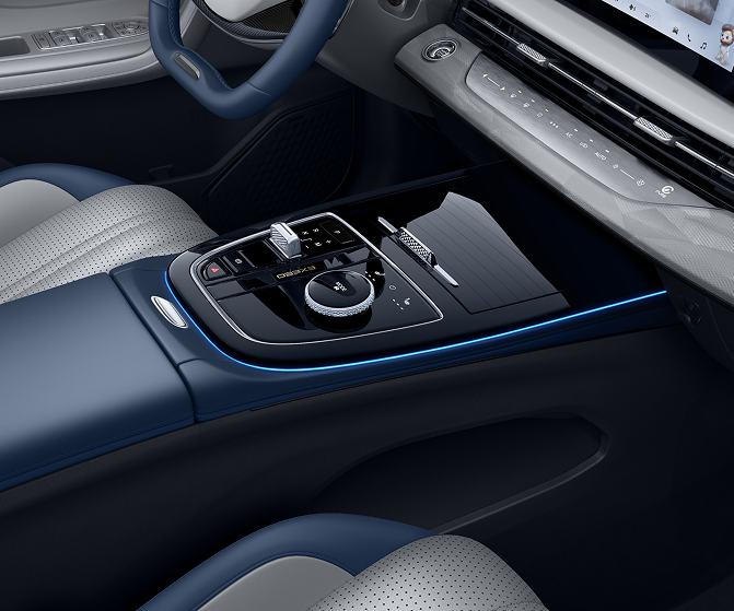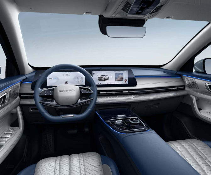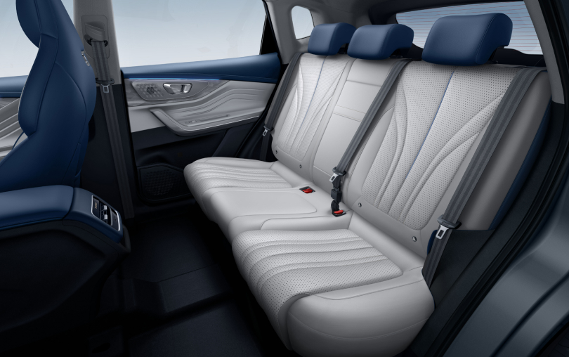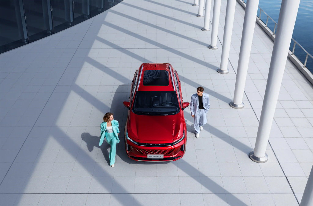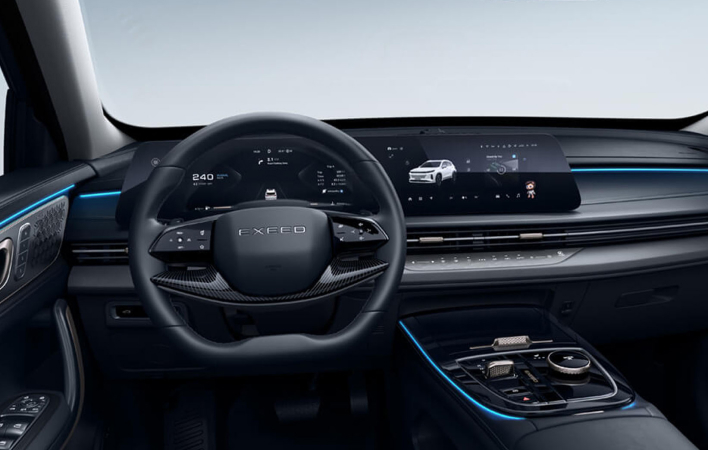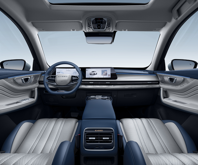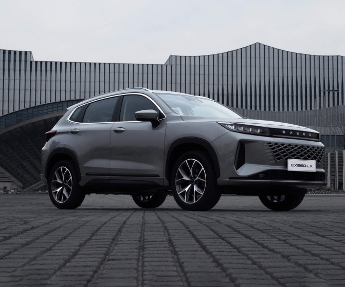 The EXEED LX features a bold and modern front face, showcasing a vertically arranged grille with a sleek chrome and black design. This design is further complemented by a hexagonal contour grille, adding layers of sophistication and premium appeal. The luxurious look is completed with a deluxe panoramic skylight and premium wheel hubs, elevating the LX’s presence on the road.